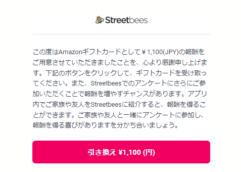 記入したメールアドレスにStreetbeesからAmazonギフトカードの引き換えリンクのついたメールが届きます。